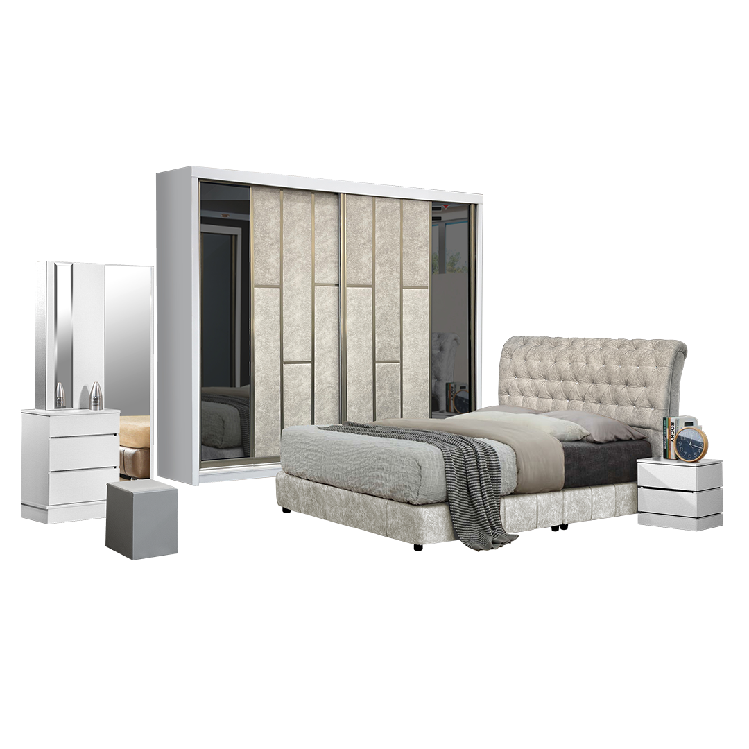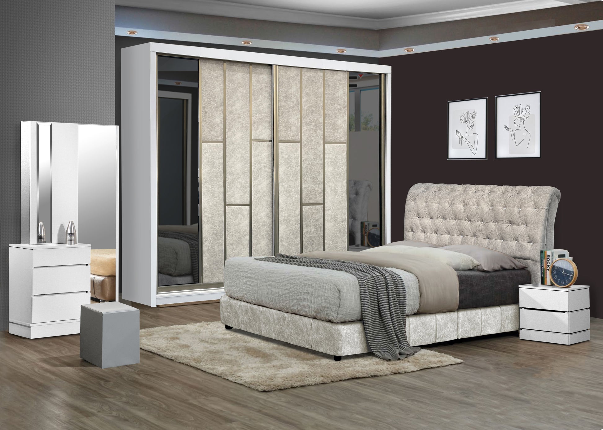 Diamond White Bedroom Set-Bedframe +Wardrobe +Dressing Table&Stool +Side Table